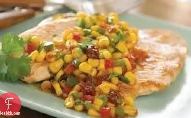 يمزج مربى الفراولة ومعجون الفلفل الحار والذرة في مقلاة. يطهى ويقلب على نار متوسطة حتى تصبح الصلصة دافئة وشمبانيا.