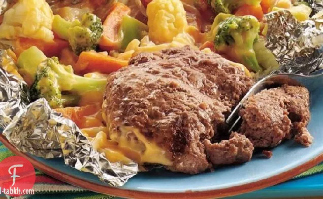 في وسط كل ورقة من ورق القصدير ، ضع 1 كوب بطاطس ، 1/4 من الخضار ورقائق صلصة الجبن ، و 1 قطعة لحم بقري. لف كل علبة بإحكام باستخدام أختام مزدوجة الطي ، مما يتيح مساحة لتوسيع الحرارة.