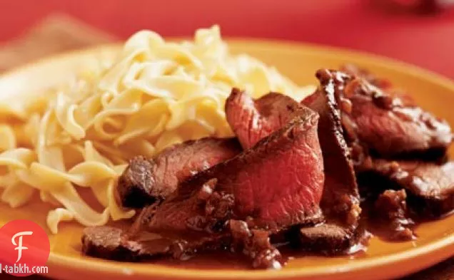 قدمي شرائح اللحم والصلصة مع المعكرونة.