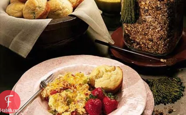 يخفق الجبن الكريمي على سرعة منخفضة بالخلاط الكهربائي حتى يصبح ناعما ؛ يضاف مزيج البسكويت بالتناوب مع الحليب ، ويبدأ وينتهي بمزيج البسكويت. ضجة في البصل الأخضر والمكونات 3 القادمة.