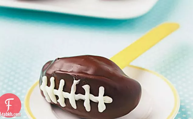 السماح لتبرد لتدفئة درجة حرارة الغرفة. تراجع أعلى عصا الحرفية أو عصا مصاصة في الشوكولاته وإدراج جزء في واحدة من كرات القدم. تراجع كرة القدم في الشوكولاته ، والسماح بالتنقيط الزائد مرة أخرى في وعاء. أدخل نهاية العصا في الستايروفوم للسماح للشوكولاتة بالتصلب بينما تكون الملوثات العضوية الثابتة منتصبة. كرر مع كرات القدم المتبقية. بردت الملوثات العضوية الثابتة لمدة 15 دقيقة لضبط الشوكولاته.