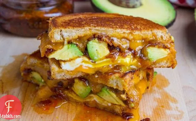 مربى لحم الخنزير المقدد وساندويتش الجبن المشوي بالأفوكادو مع البيض المقلي