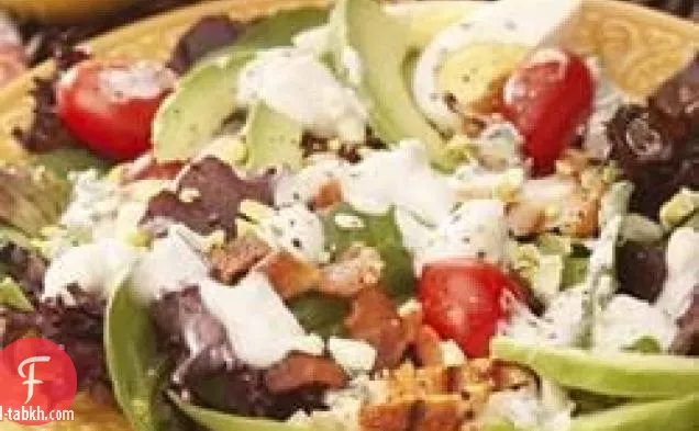 يمزج مزيج السلطة والطماطم من الحقيبة وشرائح الدجاج المطبوخة والأفوكادو ولحم الخنزير المقدد والبيض والجبن الأزرق في وعاء كبير. أضيفي صلصة الجبن الأزرق حسب الرغبة.