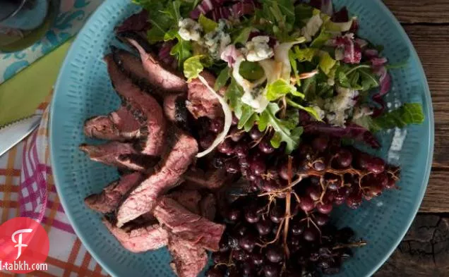 شريحة لحم مشوية مع عنب شامبانيا مشوي وسلطة خضراء مريرة وجبنة زرقاء