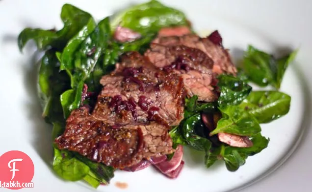 إريك ريبير شريحة لحم تنورة محروق وسلطة السبانخ مع النبيذ الأحمر-صلصة الكراث