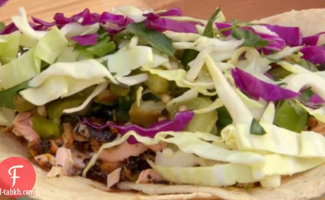 أضيفي الفيليه إلى وعاء كبير واتركيه جانبا. في غضون ذلك ، نحمص تورتيلا الذرة فوق الفحم الساخن أو على كومال مسخن مسبقا.