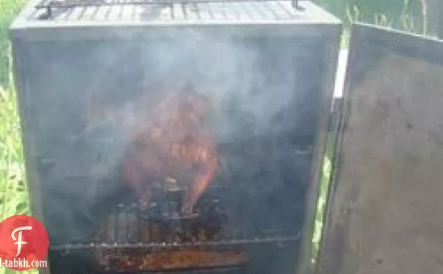 ضع الدجاج ، واقفا على العلبة ، مباشرة على الشواية المسخنة مسبقا. إغلاق الغطاء وشواء الدجاج حتى لم يعد الوردي في العظام والعصائر تشغيل واضحة, حول 1 ساعة 15 الدقائق. يجب أن يقرأ مقياس الحرارة الفوري الذي يتم إدخاله في الجزء الأكثر سمكا من الفخذ ، بالقرب من العظم 180 درجة فهرنهايت (82 درجة مئوية).