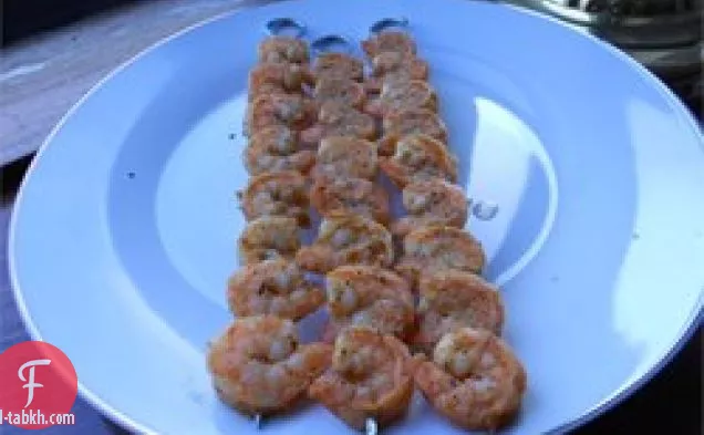 رتب الأسياخ على شواية مسخنة مسبقا ؛ اطهي الجمبري حتى يصبح لونه ورديا فاتحا من الخارج ولم يعد اللحم شفافا في المنتصف ، من 6 إلى 8 دقائق.