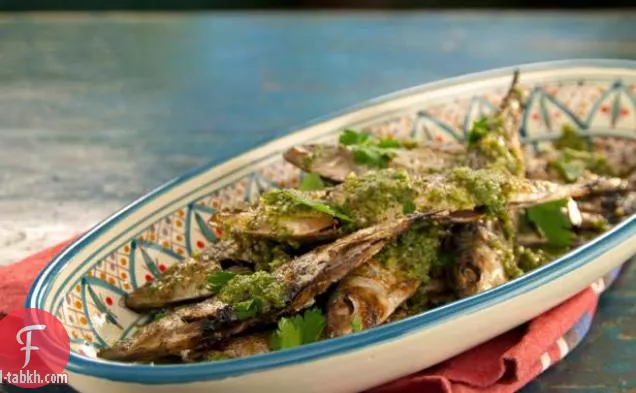 السردين المشوي مع صلصة الثوم والجوز