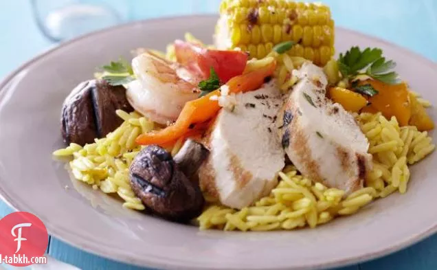 اللحوم المشوية والخضروات على الزعفران أورزو