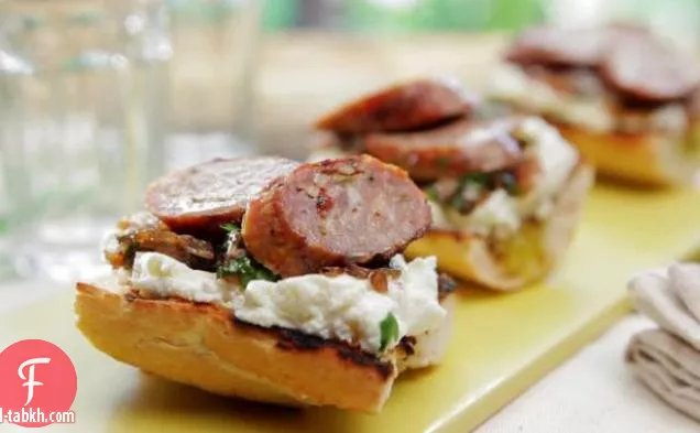 النقانق المشوية مع الكراث المشوي نكهة مع الريكوتا الطازجة والخبز المحمص