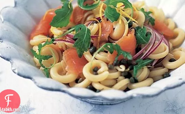 باستا سمك السلمون المدخن مع الجرجير والبصل الأحمر والكبر