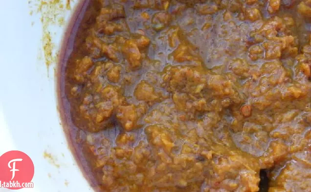 ضعي جميع مكونات المعجون باستثناء أوراق الكزبرة في سائل وأزيز حتى تصبح ناعمة ، ثم اكشطيها في وعاء.