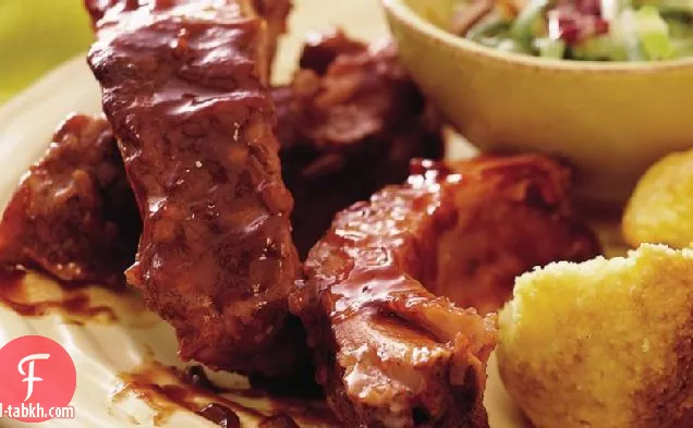 تسكب صلصة الشواء في وعاء ضحل ؛ تغمس الضلوع في الصلصة. عودة الأضلاع إلى طباخ.