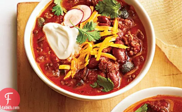 يضاف مسحوق الفلفل الحار والكمون والملح ؛ يطهى لمدة 1 دقيقة مع التحريك بشكل متكرر. ضجة في لحم البقر, مارينارا, مرق, فاصوليا, والطماطم; جلب ليغلي. خففي الحرارة ؛ ينضج ، مكشوف ، لمدة 30 دقيقة أو حتى يتكاثف قليلا. مغرفة حوالي 1 1/2 كوب من الفلفل الحار في كل من 8 السلطانيات ؛ أعلى كل خدمة مع 1 1/2 ملاعق كبيرة من الجبن ، 1 ملعقة كبيرة من القشدة الحامضة ، و 1 1/2 ملعقة صغيرة من الكزبرة.