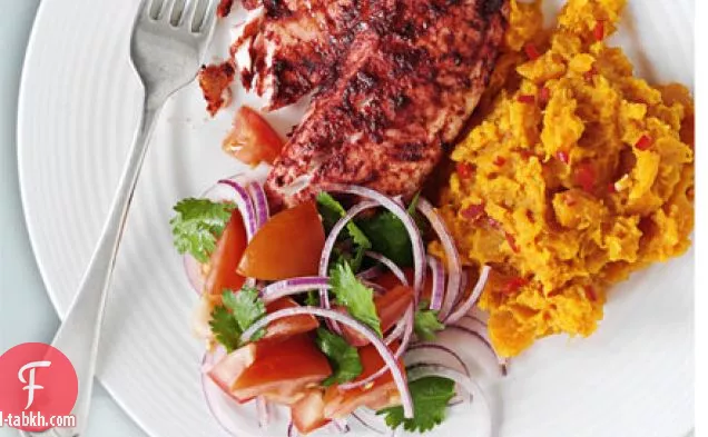 تندوري البلطي مع الهريس البطاطا الحلوة حار وسلطة الطماطم