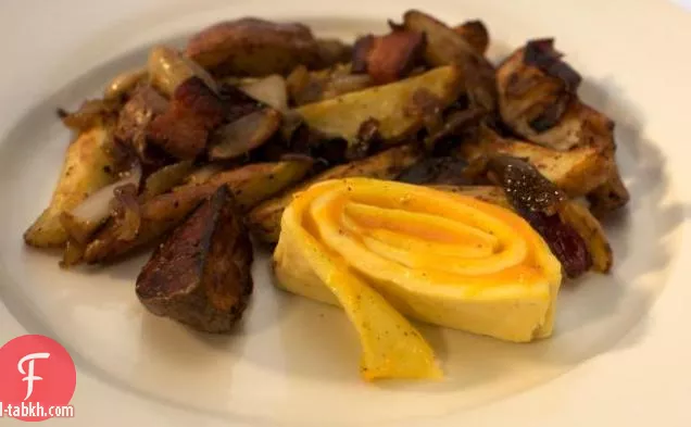 قطعي العجة الملفوفة إلى شرائح سميكة ومتساوية وقدميها مع البطاطس المحمصة باللحم المقدد.