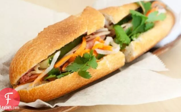 انتشر 1 ملعقة كبيرة من المايونيز بالتساوي داخل كل الرغيف الفرنسي. تحشى الرغيف الفرنسي بأربع شرائح من لحم الخنزير المقدد ، وربع كوب من الخضار المخللة ، وشريحتين من الخيار ، وبضع شرائح من الهالبي شيمو ، وأربعة أغصان من الكزبرة.