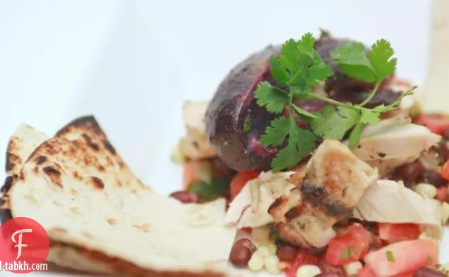 دجاج موجو متبل مع بطاطس أرجوانية مشوية و ذرة متفحمة و صلصة الفاصوليا السوداء مع دقيق التورتيلا المشوي