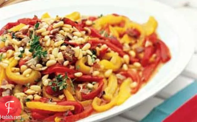 سلطة الفلفل الأحمر المحمص مع صلصة لحم الخنزير المقدد والصنوبر