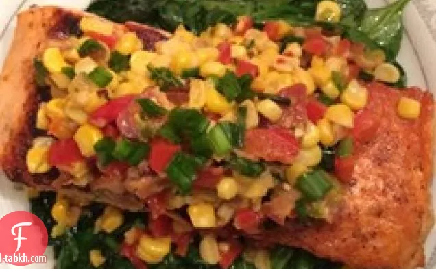 سمك السلمون المشوي مع لحم الخنزير المقدد والذرة المذاق