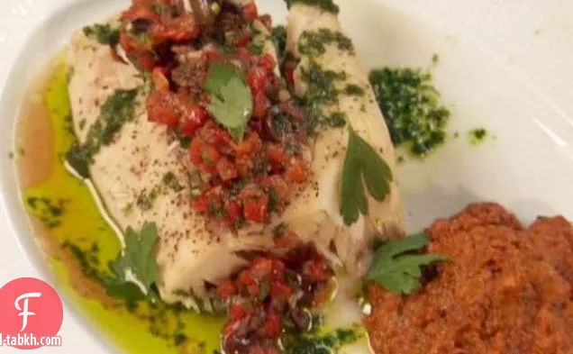 سمك القاروص البري المطهو على البخار مع صلصة روميسكو بالفلفل الأصفر والفلفل الأحمر والزيتون الأسود وزيت البقدونس والثوم