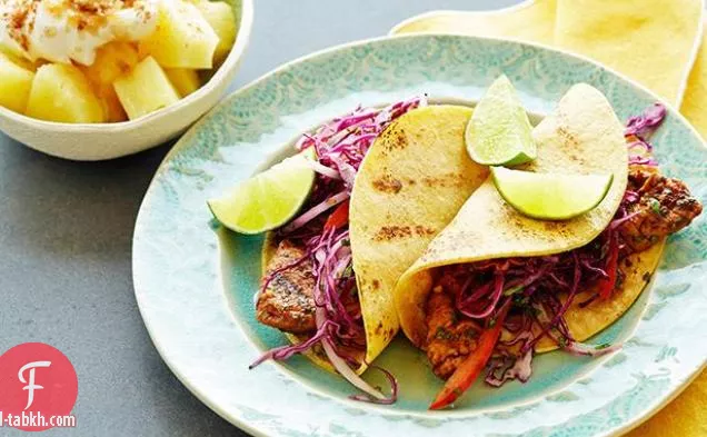 سندويشات التاكو لحم الخنزير المشوي مع سلطة الكرنب الحمراء والأناناس السكر البني