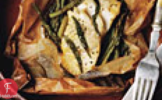 يرش السمك بالملح والفلفل ؛ أعلى كل فيليه مع 3 أوراق الطرخون ، ثم 1 قطعة من الزبدة. رتب الهليون حول كل فيليه سمك ؛ صب 1 ملعقة كبيرة من عصير البرتقال فوق كل منها. أضعاف الرق على الأسماك والهليون ، للطي و العقص حواف بإحكام لختم وأرفق ملء تماما.