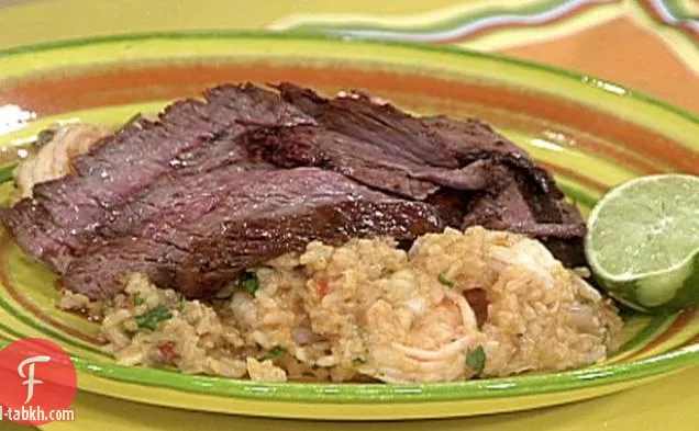 شريحة شرائح اللحم ويقدم على سرير من الأرز الروبيان ، وأكوام حبوبا جنبا إلى جنب.