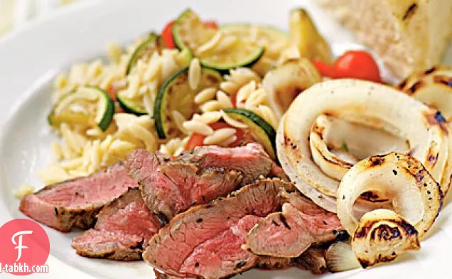 ضعي شرائح اللحم وشرائح البصل على رف الشواء المطلي برذاذ الطهي ؛ اشوي 4 دقائق على كل جانب أو حتى تصبح شرائح اللحم في الدرجة المطلوبة من النضج ويصبح البصل طريا.