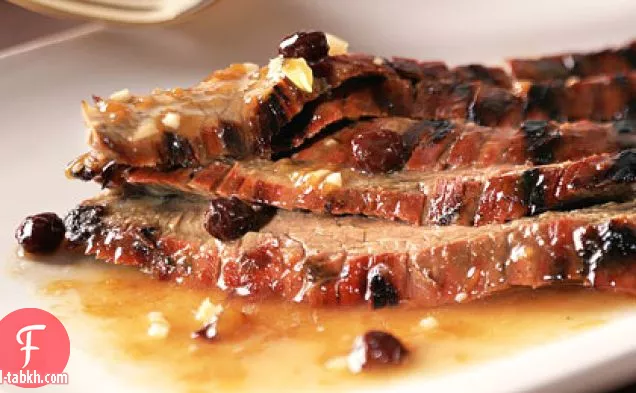 ضع شريحة لحم على رف شواء أو مقلاة اللاحم. يطهى لمدة 8 دقائق على كل جانب أو حتى درجة النضج المطلوبة.