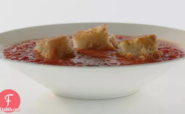 شوربة الطماطم مع الفلفل المشوي والثوم والبصل مع خبز محمص بالجبنة المشوية