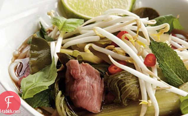 رتب 1/2 كوب نودلز في كل من 4 أوعية كبيرة. يقسم اللحم البقري النيء وشرائح تشيلي بالتساوي بين الأطباق. مغرفة حوالي 1 2/3 كوب حساء ساخن على كل حصة (مرق سوف طهي لحوم البقر). أعلى كل حصة مع 1/4 كوب براعم الفاصوليا ، 1 ملعقة كبيرة ريحان ، و 1 ملعقة كبيرة نعناع.