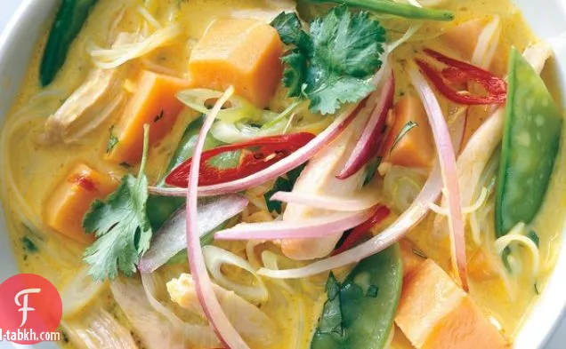 شوربة نودلز بالكاري الحار مع الدجاج والبطاطا الحلوة