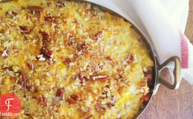 يوزع بالتساوي على خليط الاسكواش. دوت مع الزبدة المتبقية وتخبز 45 إلى 60 دقيقة ، حتى شمبانيا.