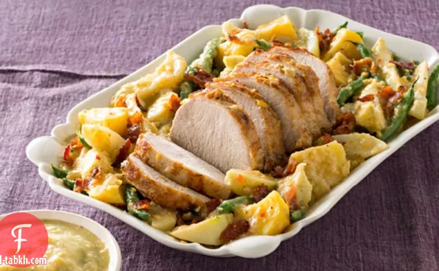 تصب في وعاء التقديم. ملعقة صلصة المتبقية على طبق; أعلى مع الخاصرة لحم الخنزير. تحيط بالخضروات المخبوزة ؛ يرش مع لحم الخنزير المقدد.