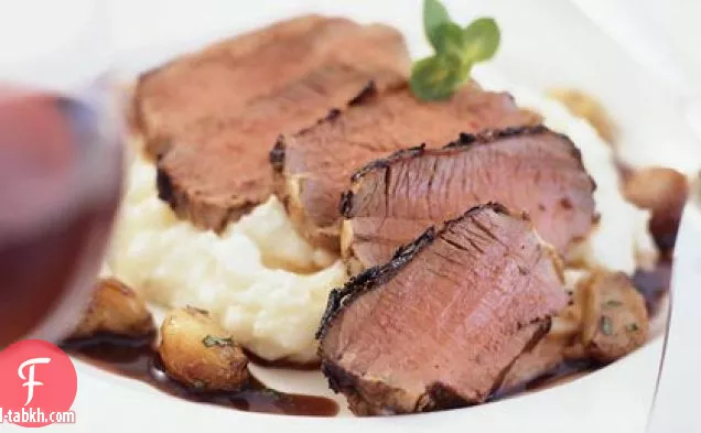 لحم خروف مشوي مع صلصة كابيرنيت بالنعناع والبطاطا المهروسة بالثوم