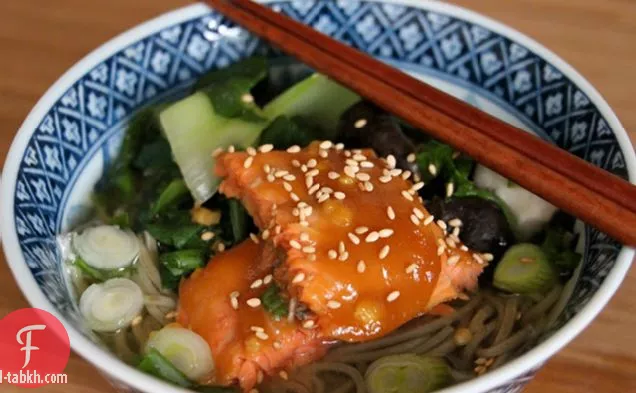 من السهل العسل ميسو المزجج سمك السلمون وسوبا حساء المعكرونة