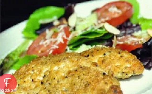 اغمس شرائح الدجاج في الزبدة المذابة ؛ اضغط على شرائح في خليط دقيق اللوز حتى تغطى بالكامل.